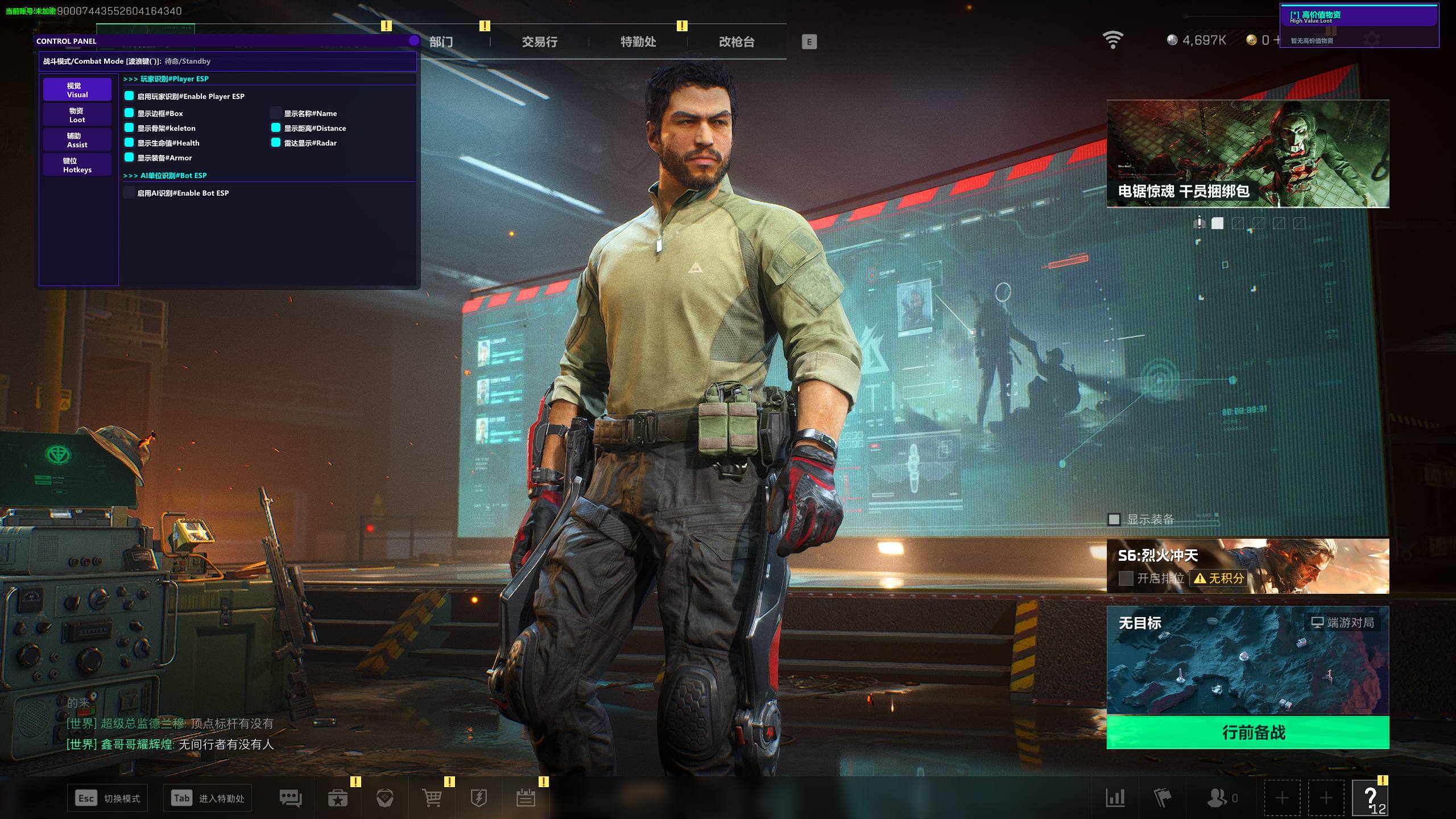 【功能列表】骨骼透视+预判自瞄+物资+名字+击杀+盒子+预警+观敌